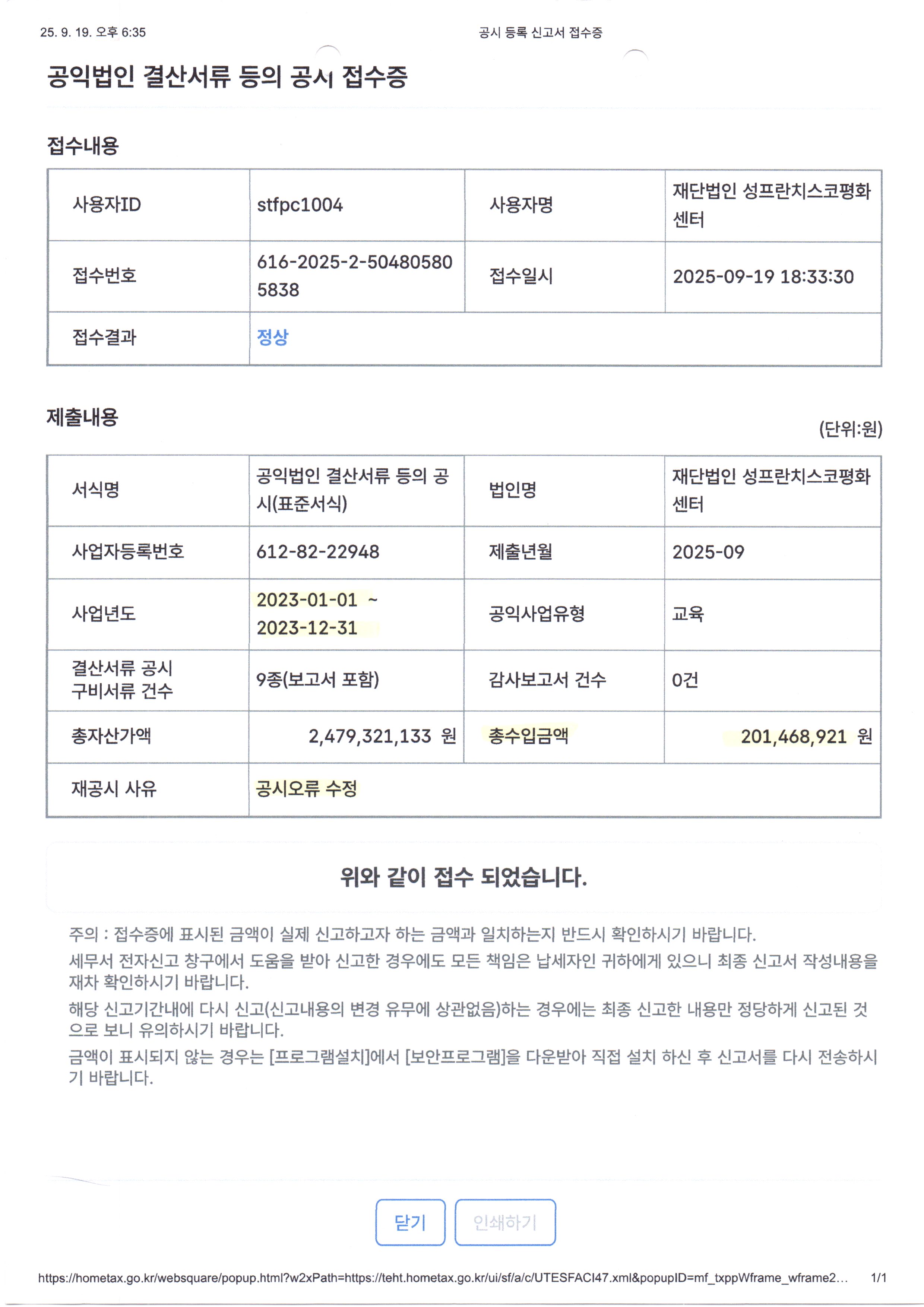 2023 공익법인등의무이행여부보고서 및 결산 서류등의공시 외 수정건 재공시